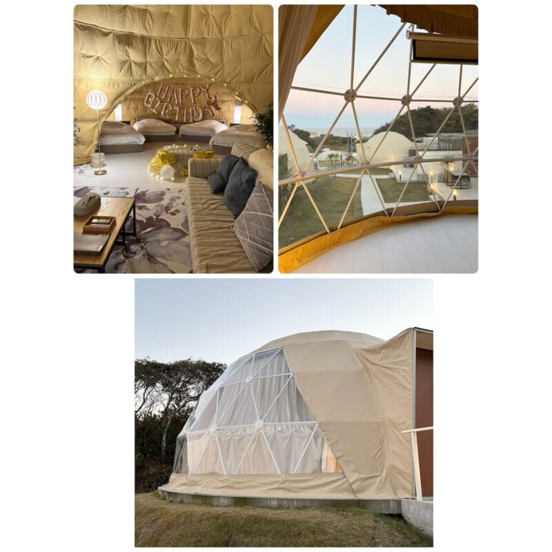 一度宿泊してみたかったドームテント。ツインドームになっているのでベッドルームも開放的で温かいのが嬉しいです。プロジェクターがついているので夜はみんなで映画を観たり、カラオケしたり、私はテントから見える空が綺麗でとーっても癒されました。海や空、自然を感じていると深い呼吸ができて体も心も整うのを感じます。