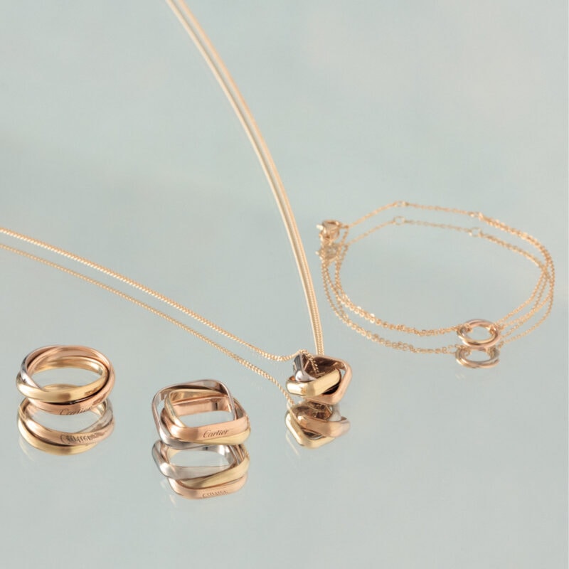 「トリニティ」左から_リング[WG×YG×PG×DIA]47万8500 円、リング36万8500円[WG×YG×PG]、ネックレス[同]58 万8500円、ブレスレット[同]26万4000円(すべてカルティエ /カルティエ カスタマー サービスセンター)