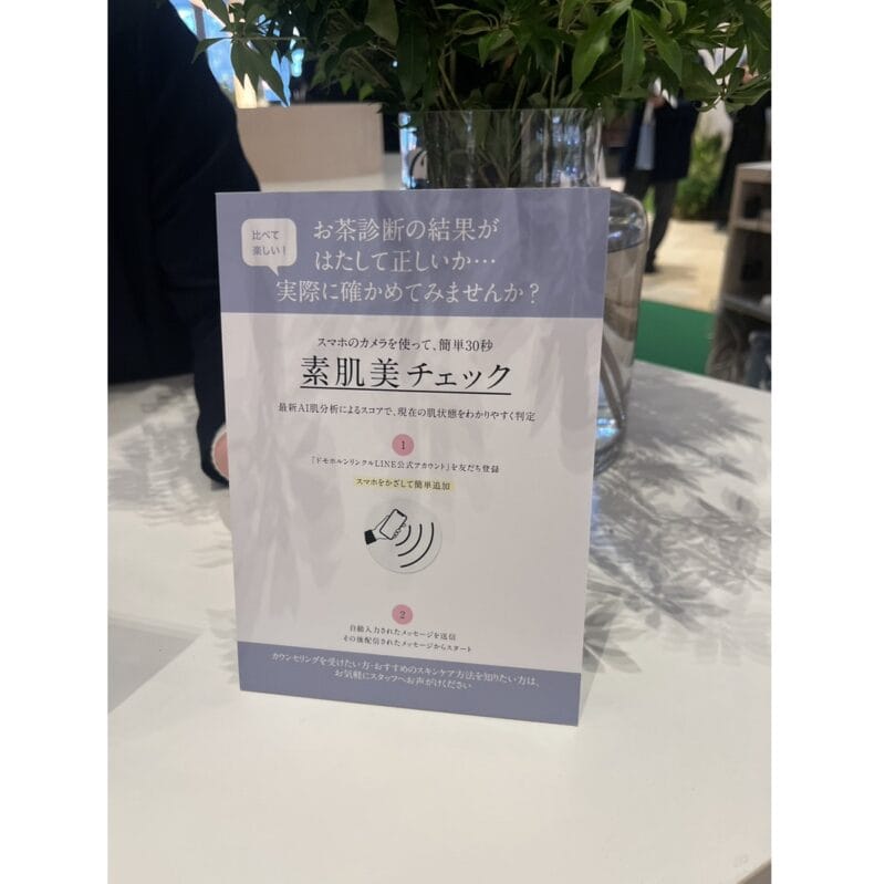 お茶診断に続いてAI肌診断もあります!さっきのお茶診断の結果が果たしてあっているのか?比べて診断すると楽しいですよね。診断の仕方はお持ちのスマホをパネルにかざすだけ!