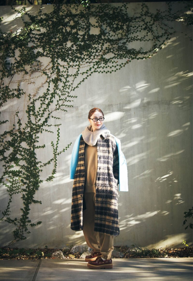 コート27万5000円(オブリオ) スエット2万8600円、パンツ3万800円(ともにハイク/ボウルズ) 肩にかけたニット3万9600円(プレインピープル/プレインピープル青山) バラクラバ7700円(リット/ピモンテ) 靴2万5300円(ティンバーランド/VF ジャパン) メガネ5万2580円(ミュウミュウ/ルックスオティカジャパン カスタマーサービス) ピアス16万5000円(カジャビジュー)