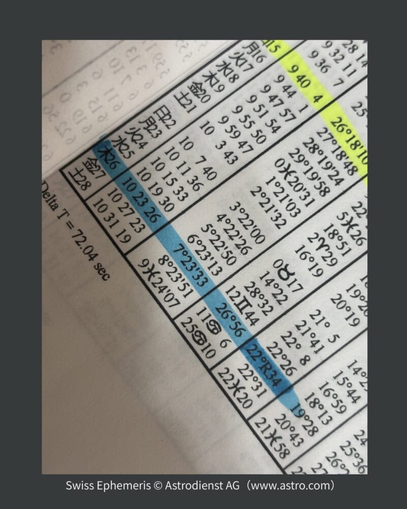 惑星位置の時系列表、エフェメリスより。