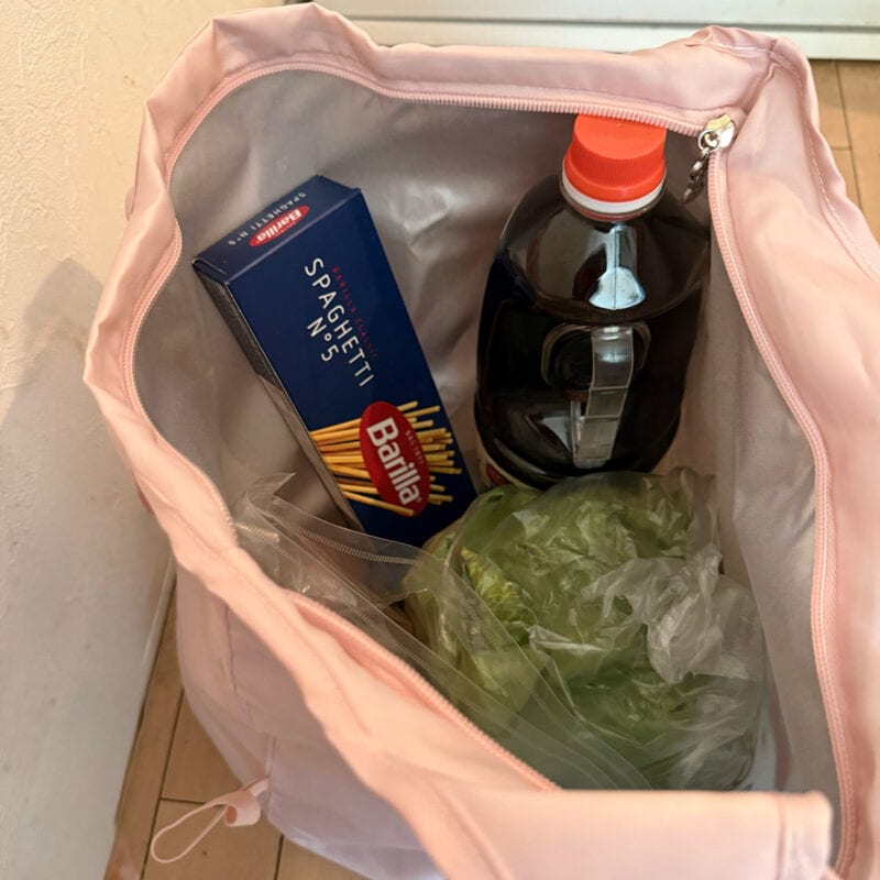 コストコマニアの私がいつも買う、業務用1.8リットルのめんつゆ、パスタ、キャベツ1球、玉ねぎ1kg入れてもまだ余裕。