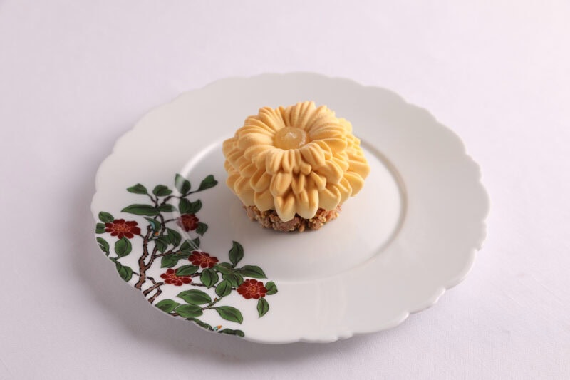 陽の光を受けて花開くような佇まいの「シトラスフラワー」。今回、個人的に最も気に入ったケーキがこちら。しっとりとしたアーモンドスポンジに、なめらかな柑橘クリームを重ね、レモンや柚子、オレンジの爽やかな香りと酸味が広がります。見た目の可憐さと裏腹に、しっかりとエッジの立った味わいです。
