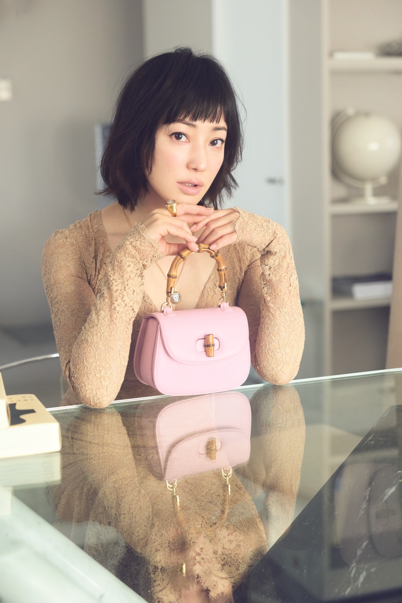 バッグ「GUCCI BAMBOO 1947」[H11.5×W17.5×D6cm]59万4000円、ドレス70万4000円、ネックレス7万9200円、リング7万9200円(すべてグッチ/グッチ クライアントサービス)