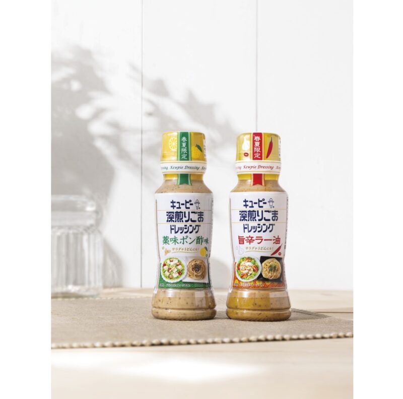左から:キューピー 深煎りごまドレッシング 薬味ポン酢味、同 旨辛ラー油 各180mL 290円