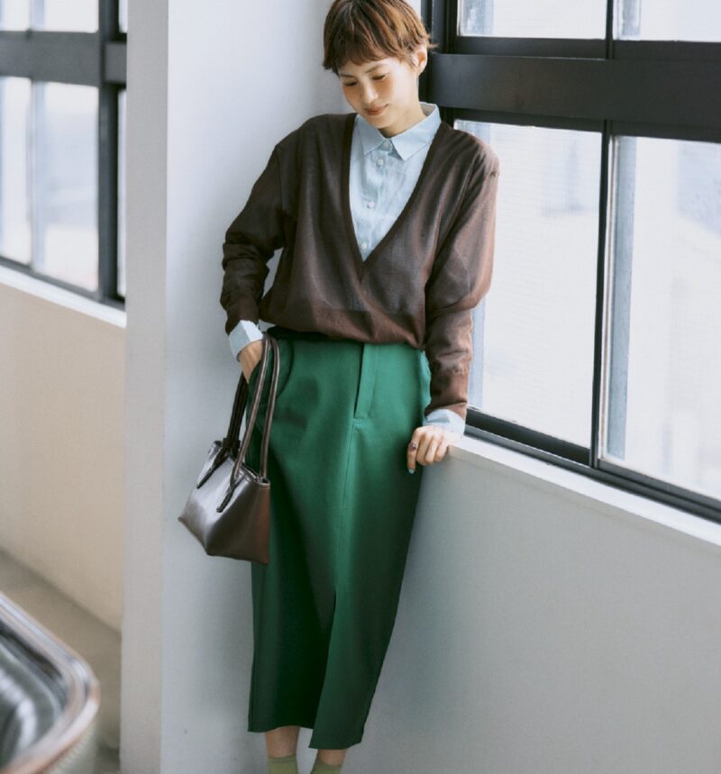 リネン洗いざらしレギュラーカラー長袖シャツ3990円(無印良品/無印良品 銀座)、Vネックニット4万4000円(オブリオ) スカート2万3100円(ティアラ) リング35万2000円(マリハ) バッグ2万3100円(アンドミューク/アマン)