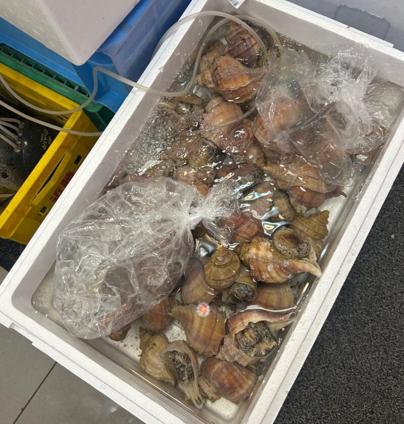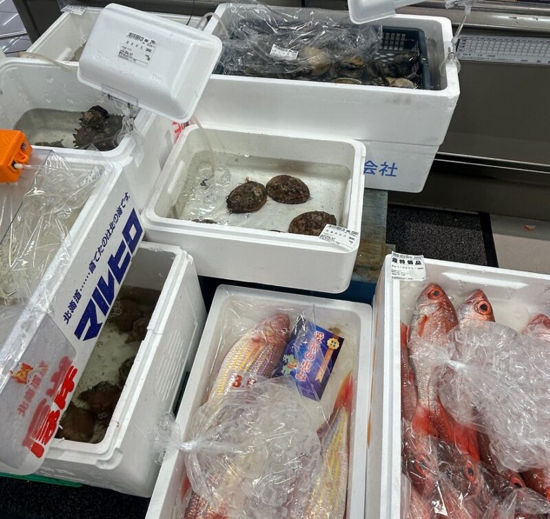オオゼキ池尻店の鮮魚コーナーを見たら誰もがきっと驚くはず。水槽用エアーポンプが設置された箱の中にツブ貝やアワビ、ハマグリがイキイキと鮮度の高さを感じさせる佇まいを見せています。もちろん貝類だけでなくいとより鯛、あじ、黒むつ、のどぐろなんて高級魚も。さらに伊勢海老、ボイル毛ガニ、生きてるずわいガニもいる!いったいこのスーパー、どうなってるの!