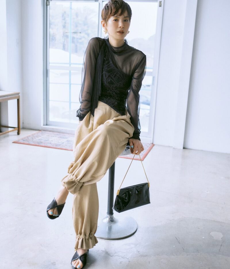 ワンショルダートップ3999円(エイチ・アンド・エム/H&Mカスタマーサービス)シアートップス1万9800円(ヌエ バイ ニアーニッポン/ニアー) パンツ4万1800円、ピアス2万7500円(ともにフミエタナカ/ドール) バッグ7万5900円(マエストソ/オブリオ) サンダル1万8480円(エピュレ/ハウス バイ ジャック オブ オール トレーズ)