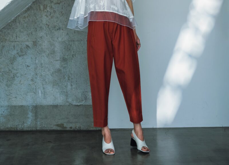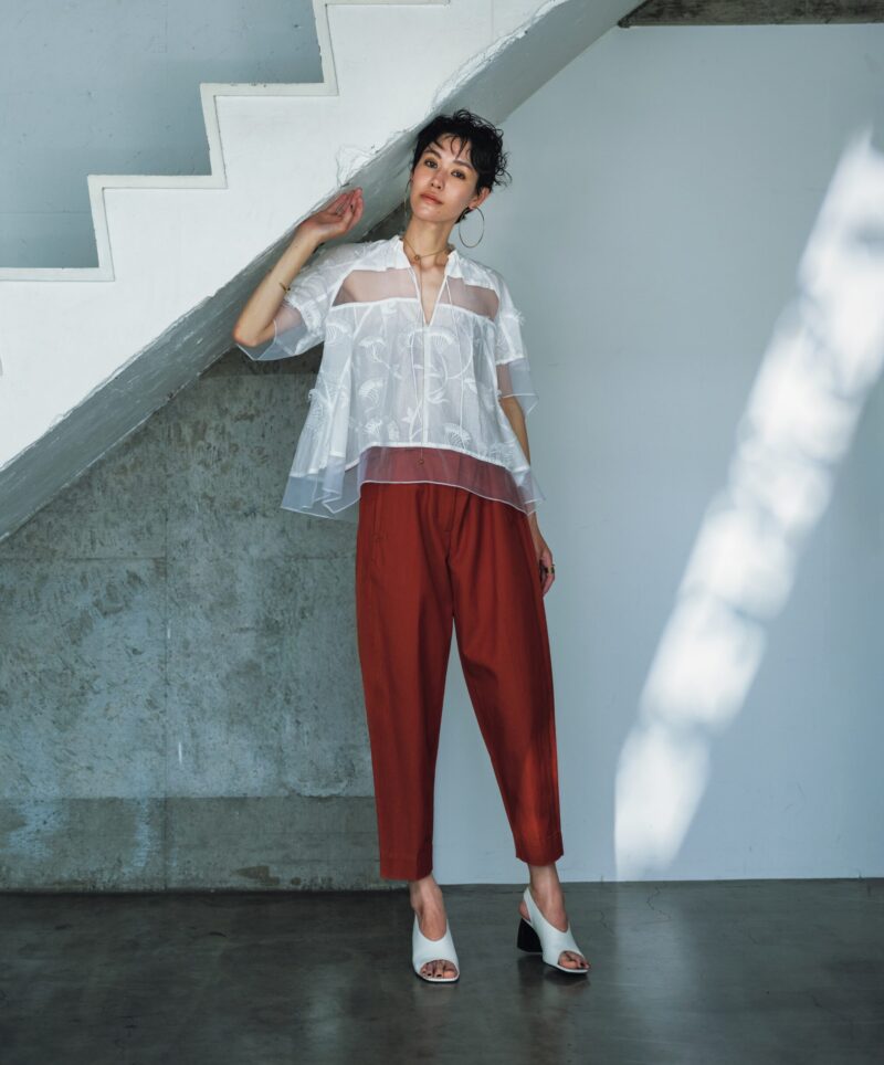 バレルシルエットの絶妙な曲線がすらっと美しい脚を連想させるパンツを主役に。揺れるシアーブラウスを合わせ、装いにさわやかな躍動感と抜け感をプラス。
