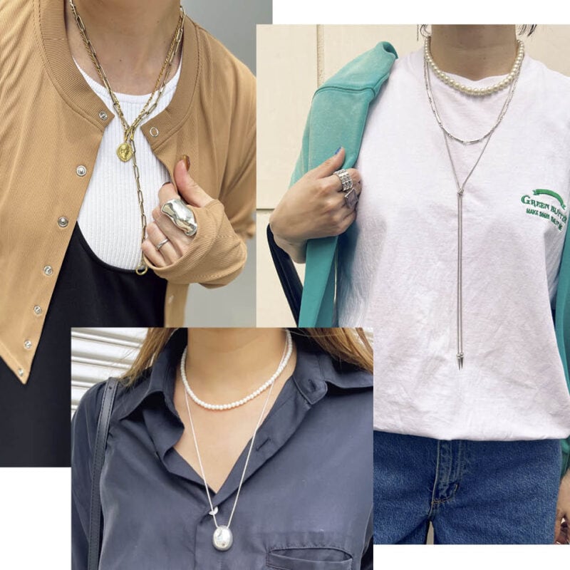 装いにきちんと感を添えるキーピースとして、ショートネックレスが急浮上。特に、マットなカラーやシアーな質感の天然石が大人気。さらに、ロングネックレスをレイヤードして盛るのもアリ。