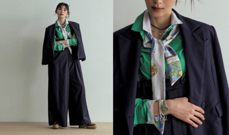【40代おしゃれ】紺色の通勤スタイルは、グリーンの差し色シャツ&スカーフで一気に洒落る!