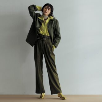 ベルトを二重に巻いているように見えるデザインパンツは、腰位置が高く見えて抜群の脚長効果を発揮。差し色のイエローは、袖をラフにまくって、袖口からもちらりと見せることで、コーデ全体を華やかにしてくれます。