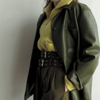 ジャケット6万1600円(バウム・ウンド・ヘルガーテン/S&T) ニット4万6200円(ティッカ) インナー2万4200円(マリリンムーン/マリリンムーンオンラインストア) パンツ2万1780円(ゴスペル/ザ・ウォール ショールーム) ブーツ8万9100円(ペリーコ) ネックレス〈ハート〉1万9140 円、〈チェーン〉1万6940円(ともにベン・アムン/ZUTTOHOLIC)〈赤玉〉2万4200円(オクチジュエリー/フラッパーズ)