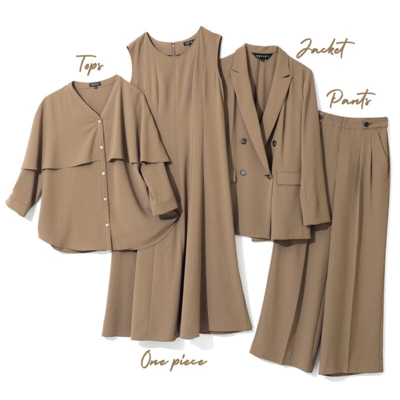 右から、はき心地がよく長時間座ってもキレイをキープ。パンツ1万6940円、カーディガン感覚で着られる軽やか仕立て。しなやかな風合いでこなれた雰囲気に。ジャケット1万9910円、ウエストをシェイプしたエレガントなフレアシルエット。ワンピース1万9910円、ケープ風のラッフルデザインが特長。裾をインするとクロップドトップスのように見えてお洒落。ブラウス1万4960円(すべてインディヴィ/ワールド プレスインフォメーション)