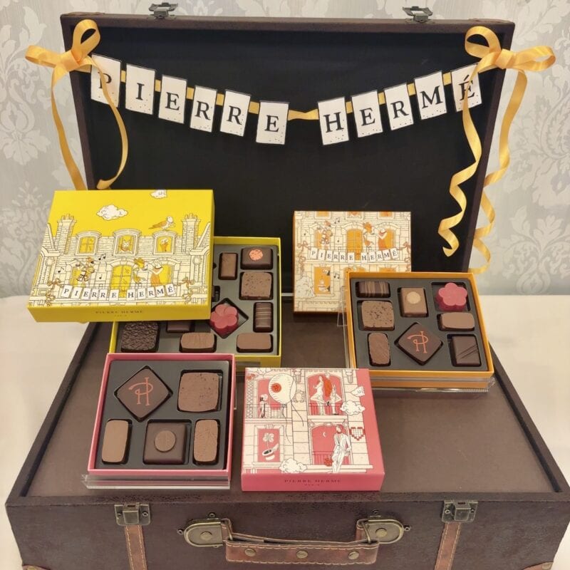バレンタインシーズンのパッケージを飾るのは、イラストレーターのジュリー・セール。「パティスリー界のピカソ」と称されるピエール・エルメが生み出すアートのようなスイーツに、彼女が描くパリの街の息づかいが重なり、特別な世界観をつくり出します。光、ロマンス、そして愛の街・パリ。その情景が箱の上で色鮮やかに広がる、心まで華やぐホリデーコレクションでした。