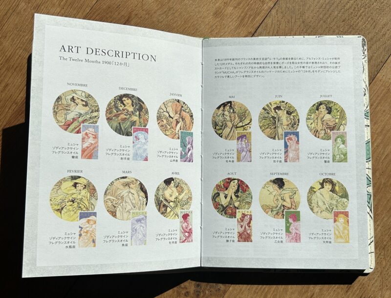 新しい手帳を開ける時って心が躍りますよね。この手帳はそのわくわく感がさらにアップするギミックが。この手帳には1899年に創刊されたフランスの美術文芸誌「ル・モワ」の表紙を飾るためにミュシャが制作した「12か月」という作品をアレンジしたアートが手帳にプリントされているのですが、12か月分をまとめてカラーで紹介しています。