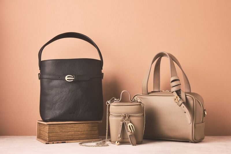 左から:レザーバケットバッグ[横19×高さ18×マチ10cm]2万7500円、バニティバッグ[横8.5×高さ11×マチ5cm]1万4300円、レザーボストンバッグ[横20×高さ12×マチ9cm]2万9700円(すべてミュシャ/マッシュスタイルラボ)