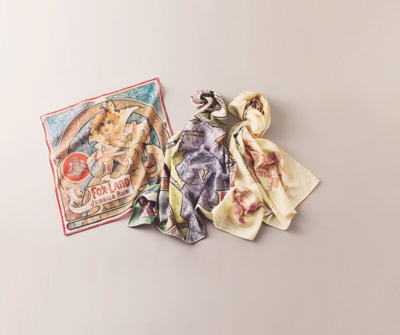 左から:ハンカチ ジャマイカ・ラム2640円、ウールシルクストールB 2万5300円、ウールシルクストールA 2万5300円(すべてミュシャ/マッシュスタイルラボ)