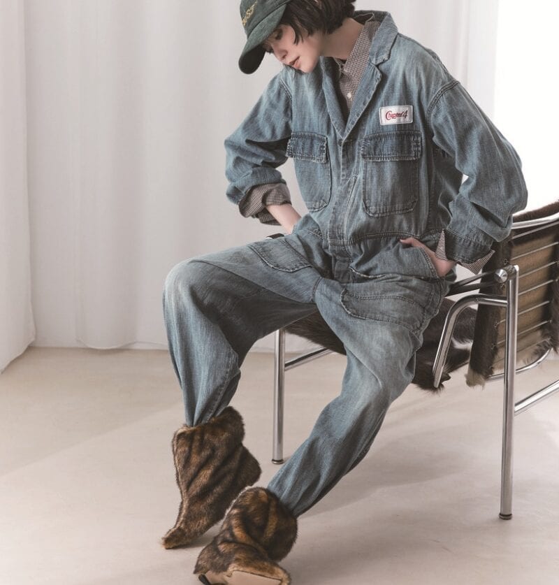 ファーブーツ[H3cm]5万2800円(ピッピシック/ベイジュ) ジャンプスーツ20万3500円、シャツ5万7200円(ともにマディソンブルー) キャップ9900円(77circa)