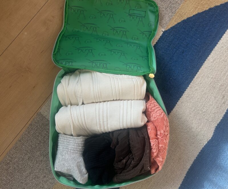 そして大きいポーチのサイズは縦22×横22×マチ6.5cm。みなさん、意外とこんな大きいサイズのポーチってあんまりないですよね。このポーチ、何が便利って下着の収納にめちゃくちゃ便利なんです。旅行の時私は巾着にまとめて入れることが多いのですが、これはちゃんとたたんで型崩れすることなくスッキリと持ち運べるんです。Tシャツ3枚が入るということですが、厚手のタンクトップ2枚、パンツとブラジャーのセット2つ、靴下2つ、と2泊分の旅行で必要な下着類を収納できました。