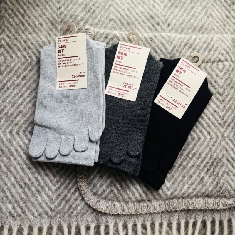 普段お家履きとして無印良品の5本指ソックスを愛用。もうこれがないと私、無理です。5本指ソックスの良い点は足指の可動域が広がり血行が良くなる事、足指の1本づつを支える力が強くなり地面をしっかり歩ける、重心が安定して姿勢が良くなる。