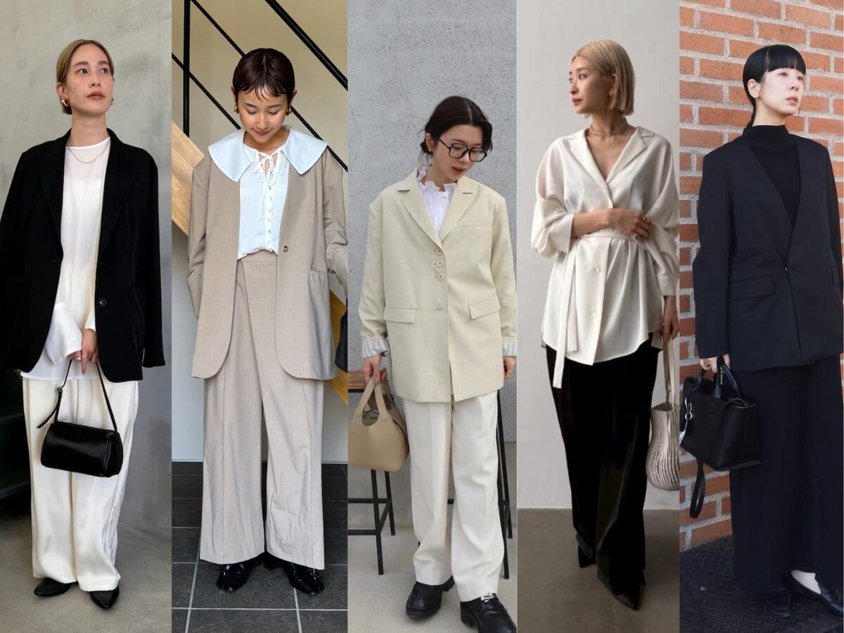 やわらかなベージュのセットアップに、ビッグカラーで抜け感を