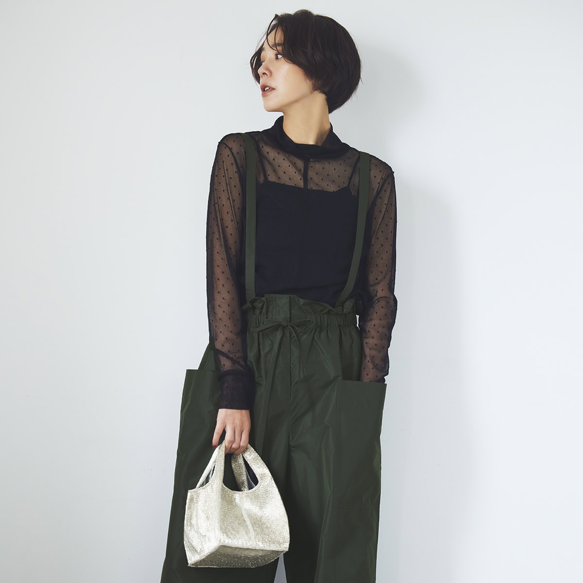 無彩色の黒はブルベのカーキと相性抜群。シアートップスでコーデに奥行きを。